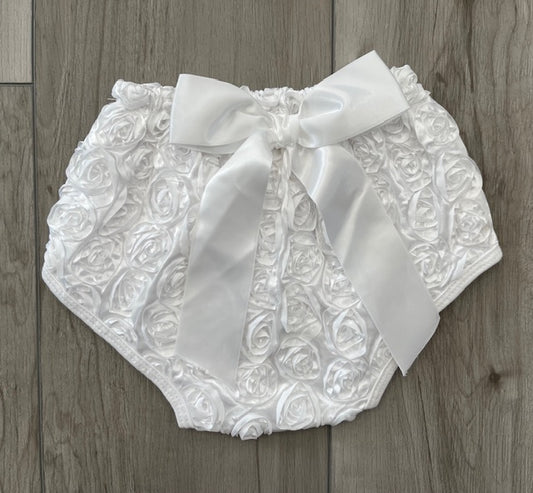 Baby Girls White Satin Rosette Bloomers | Great for Christening, Wedding White Toddler Diaper Cover | ADORABLE!