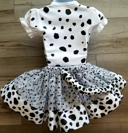 Girls 3 Piece DALMATIAN Costume Ribbon Tutu Outfit Includes Ribbon Tutu, Tshirt or Onesie & MATCHING Headband | Puppy Halloween Tutu