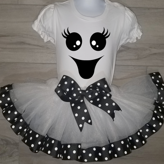 Girls 3 Piece GHOST Costume Ribbon Tutu Outfit Includes Ribbon Tutu, Tshirt or Onesie & MATCHING Hair Bow | Ghost Tutu Dress Halloween Tutu