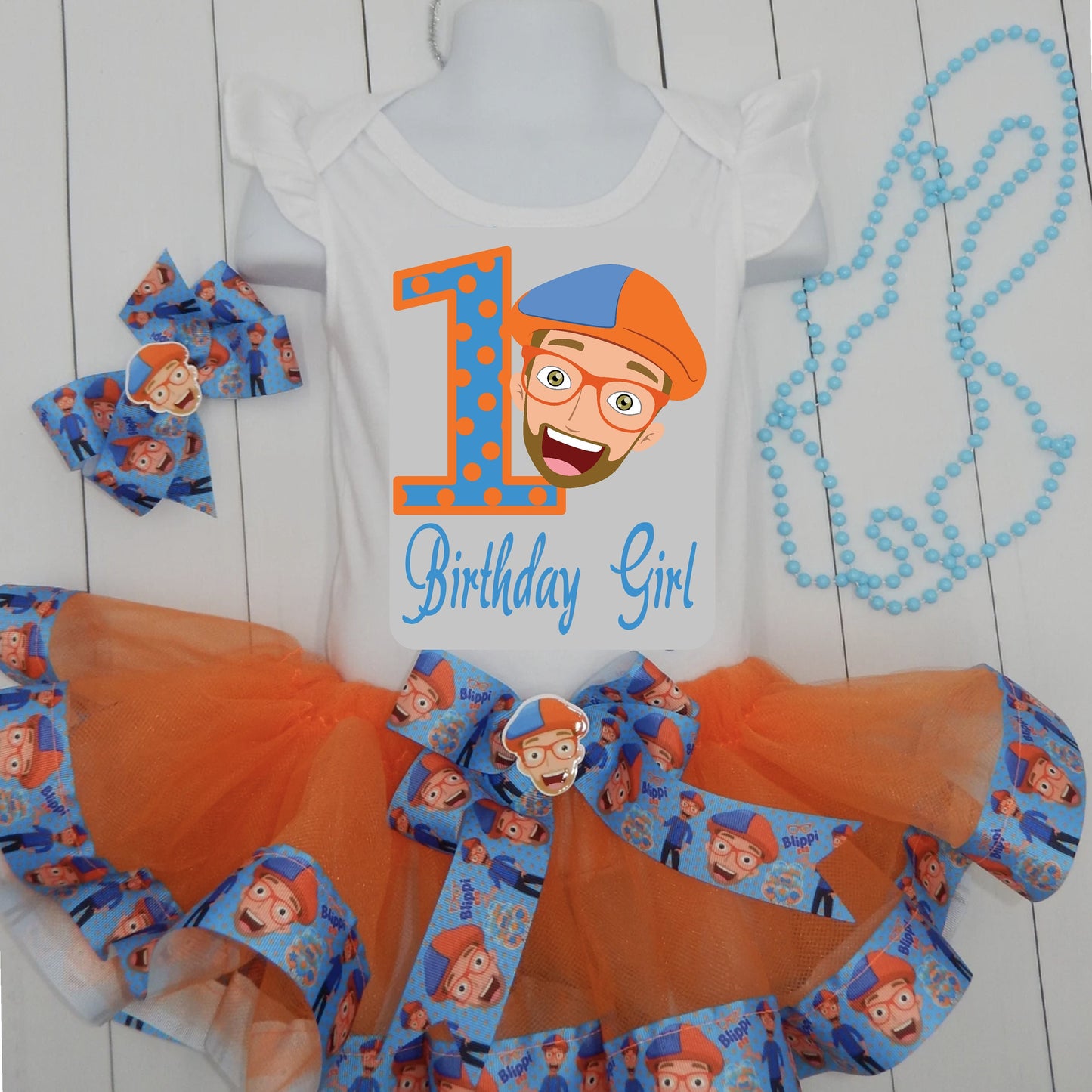 Girls BLIPPI 3 Piece Ribbon Tutu Outfit | BLIPPI Birthday Ribbon Tutu, Tshirt and Matching Hair Bow | Blippi Birthday Dress