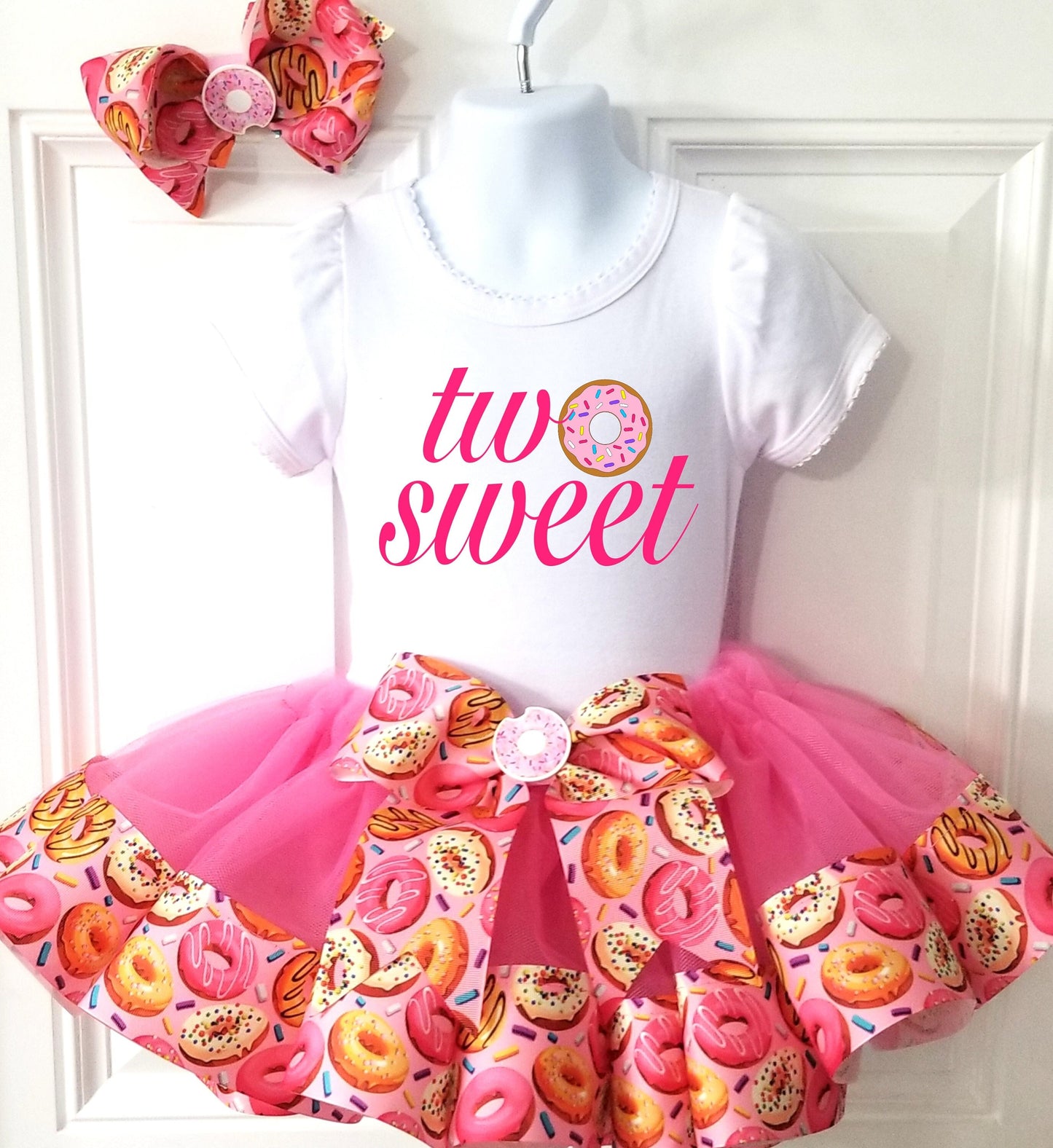 Girls TWO SWEET 3 Piece Ribbon Tutu Outfit | DONUT 2nd Birthday Ribbon Tutu, Tshirt or Onesie and Matching Hair Bow | Adorable!